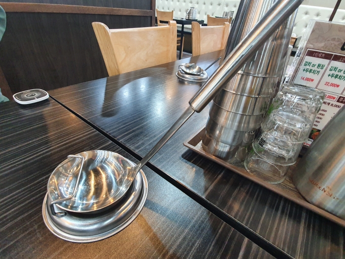 근데 이게 뭘까? 찌개 떠 먹는 국자를 보통 놓을 데갸 없어서 냄비에 슬쩍 엎어서 올려 놓는 게 일반인데 이 집은 국자를 세워 놓을 수 있는 아이디어 상품이 테이블 위에 하나씩 있었다는 것이다.