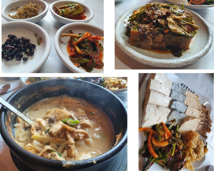 모든 음식재료를 지역 농산물을 쓰기에 믿음이 간다. 충남의 로컬푸드 미더유. 오가피순, 다래순, 뽕잎, 취나물, 서리태, 구기자순, 파김치, 상추, 도토리묵..