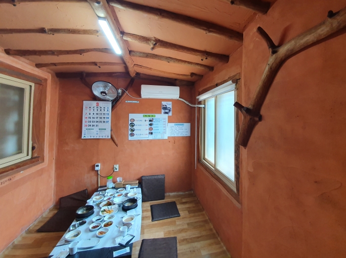 실내 인테리어도 참으로 고풍스럽고 서민적이다. 서까래가 다 보이고 황토흙으로 도배가 되어 있는 힐링공간이다. 황토방에서 점심을 먹을 때 가야금 소리가 들려오면 좋으련만..