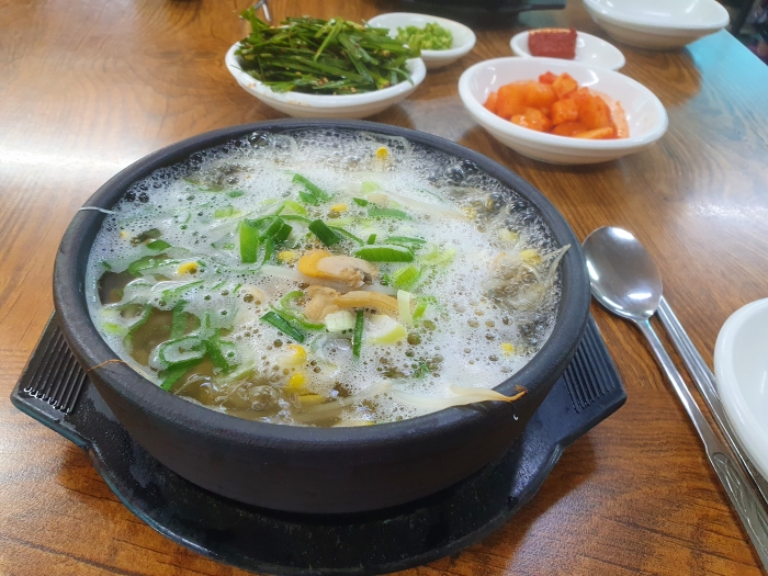 콩나물과 바지락이 주로 들어가고 부추무침 다진고추 고추장다대기 함께 넣어 먹는 게 보통