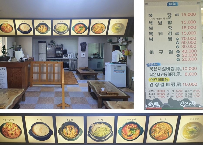 해장복국 8000원 / 복탕매운맛, 복지리 15000원 / 복지리냄비 15000원 / 복찜 中50000원 大70000원 / 묵은지찌개 7000원 / 묵은지갈비찜 小20000원