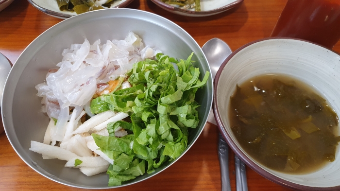 한치는오징어보다도 성질이 지랄같아서 잡아서 식탁에 까지 성하게 운반하기가 쉽지 않다고 그래요. 그래서 아예 냉동한치를 쓰는 것이 상례랍니다. 거의 대부분의 식당에서 냉동한치를 쓴다는데, 여기는 생한치를 비싸게 공급을 받아 옵니다. 생한치물회로도 먹고 생한치비빔밥으로도 먹습니다.