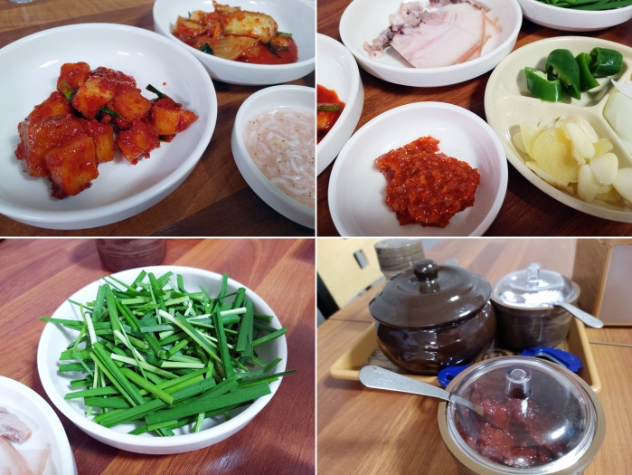 빨갛게 익은 깍두기며 김치. 그리고 맛보기 수육.