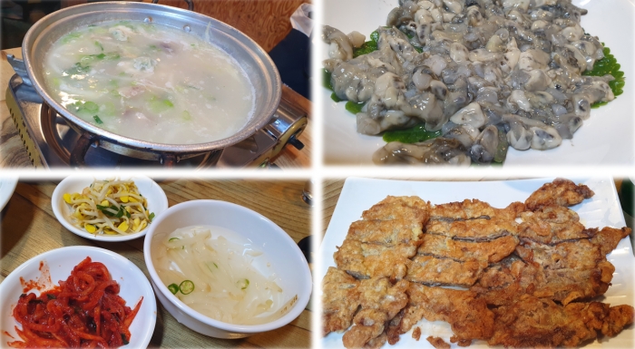 스지탕 굴보쌈 모듬전 돼지김치찌개.. 생굴도 육전도 맛있네요. 크기가 작은 생굴은 자연산이라서.