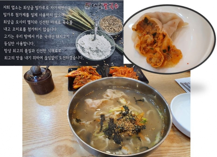 저희 업소는 최상급 밀가루로 자가제면하고 밀가루 첨가제를 일체 사용하지 않으며 최상급 오사리 멸치와 신선한 야채로 육수를 내고 조미료를 첨가하지 않습니다. 고기는 우리땅에서 키운 국내산 돼지고기 등심만 사용합니다. 항상 최고의 품질과 신선한 식재료로 최고의 맛을 내기 위하여 끊임없이 노력하겠습니다 ^^