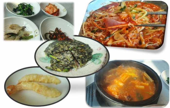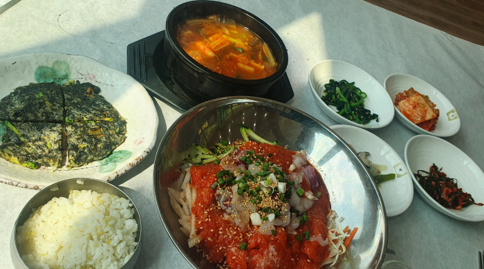 물회나 회덮밥을 시키면 이렇게 해초전이나오고 매운탕도 새우튀김도 신선한 반찬도 딸려 나옵니다. 바닷가에서 이렇게 정성들여 곁들이 음식을 해 주는 집이 흔치 않아서 잘 먹고 나왔습니다.