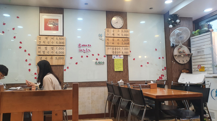 잔치국수 5000원, 비빔밥 7000, 비빔국수 6000, 냉국수 5000원 ..