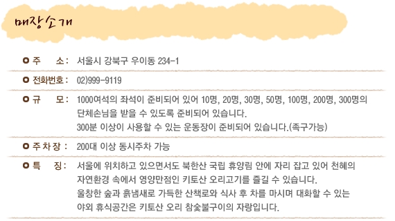 주메뉴 : 막걸리, 도토리묵 키토산오리 오리훈제 고추장삼겹살