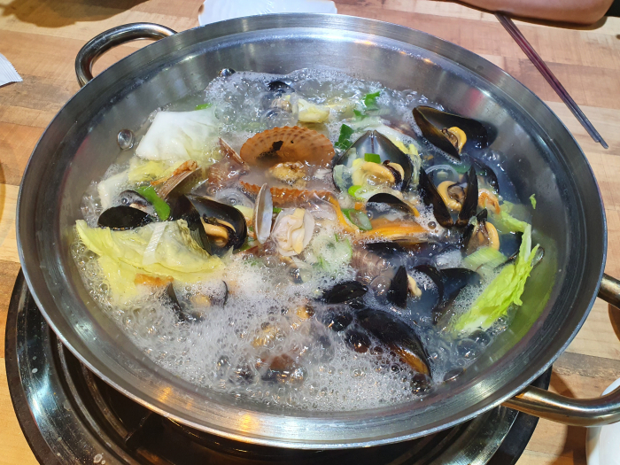 조개 전골에 청양고추가 들어가는데 정말 개운합니다. 국물이 짜지도 않습니다.