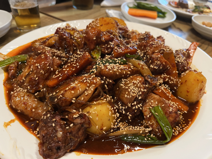 닭도리탕을 시켰는데 닭찜 같은 느낌이어서 국물이 없고 당면이 들어 있는데 아주 맛있어요