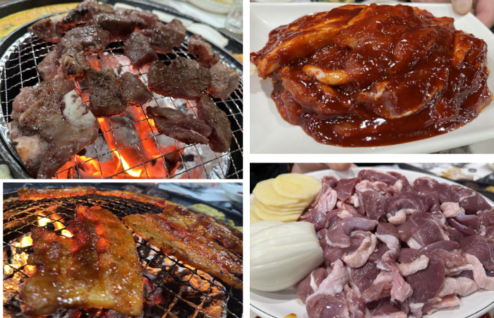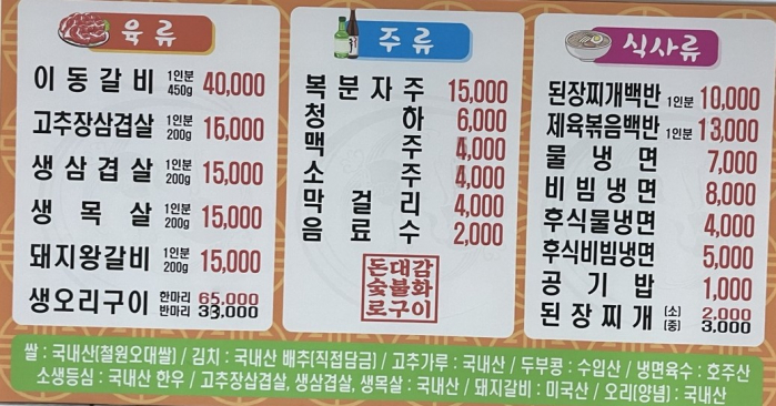 이동갈비 / 고추장삼겹살 / 돼지왕갈비 / 오리생구이 등의 숯불화로구이