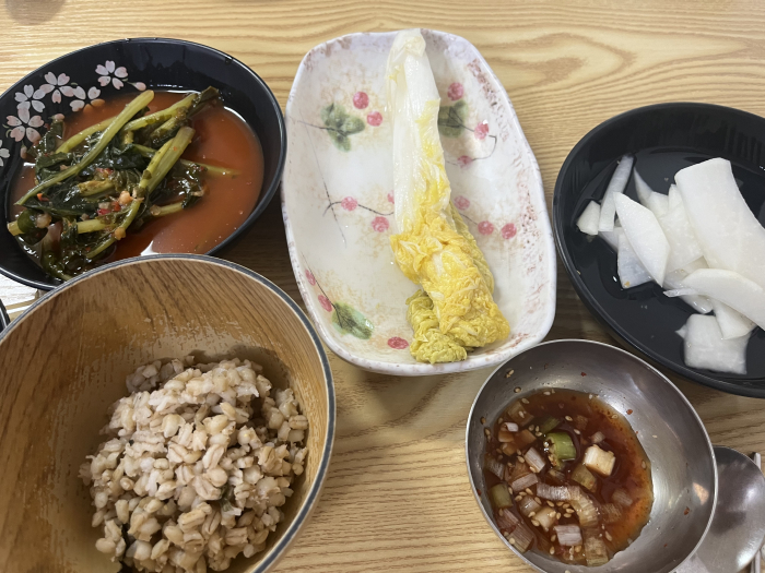 막국수 시켰는데 미리 서비스로 주는 한줌 보리밥과 열무김치 백김치..