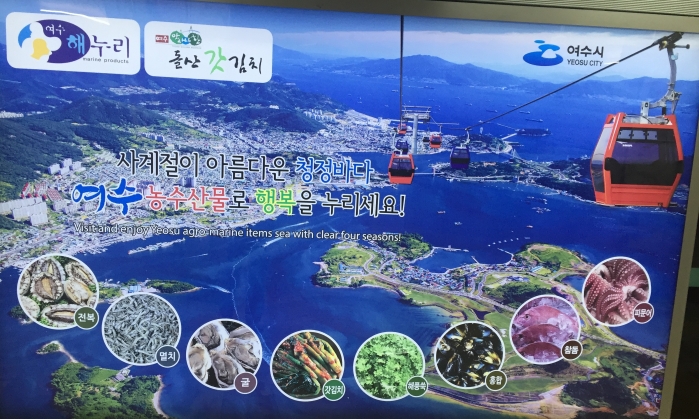 청정바다와 여수 농산물을 주로 자랑하는데 여수 해상케이블카와 돌산갓김치가 대표 상품으로 나온다.