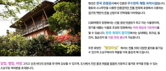6,000여평의 정원 안에 소나무와 자연석 그리고 야생화가 조화를 이루며 바다 전망이 좋은 한옥체험을 즐긴다. 한국관광공사에서 인증한 우수 한옥체험 숙박시설이다.