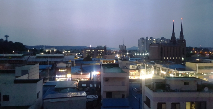 그리고 창밖을 보면 제일감리교회가 보이고 포구쪽 일몰 풍경이 보인다.