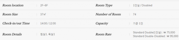 객실(Standard Double-Disabled)로 구성되어 있으며 합리적인 가격으로 장기투숙에도 부담없이 이용하실 수 있습니다.