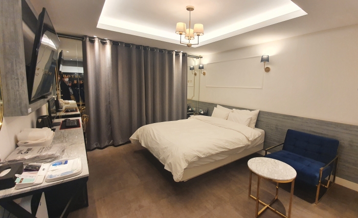 조용한 아늑한 침실, 뽀송뽀송한 이부자리, 대형 벽걸이TV, 공기청정기