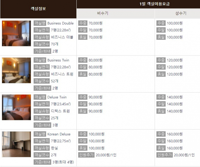 객실: 침대, 실내가운, 티 테이블, 협탁, 화장대, 헤어드라이기, 스탠드, 냉장고, 에어컨, LED TV, 전신거울, 전기포트, 무료티백, 무료생수 1박기준 2병, 유무선인터넷, 유니버셜 어댑터, 스킨로션, 욕실용품