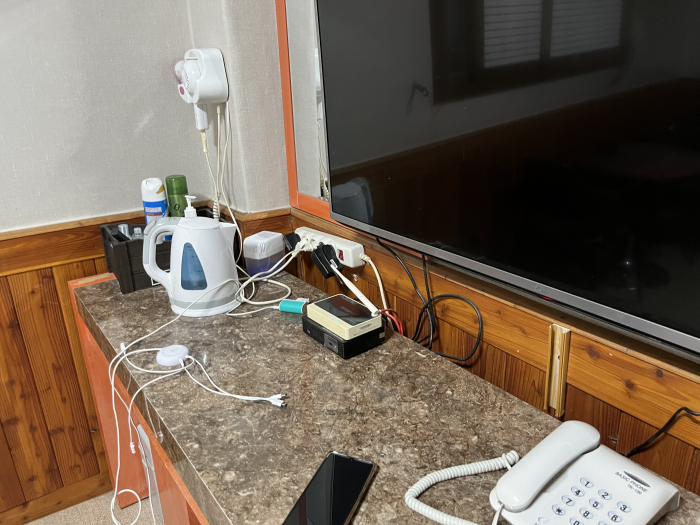 인테리어가 고급스럽지는 않지만 뜨거운 물 잘나오고 이불 뽀송, 테레비 잘 나오고 냉장고 속에 음료도 제공되고 폰 충전기도 있고 와이파이도 되고 헤어드라이어 화장품 어메니티 .. 매우 조용하고 아늑하고 공기 좋고 그럼 됐지유~