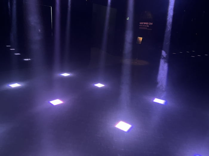 어두운 공간에서 관람객을 맞이 해주는 Biomimicry의 근원인 모르포나비의 연출과 바닥조명, LED팬 연출