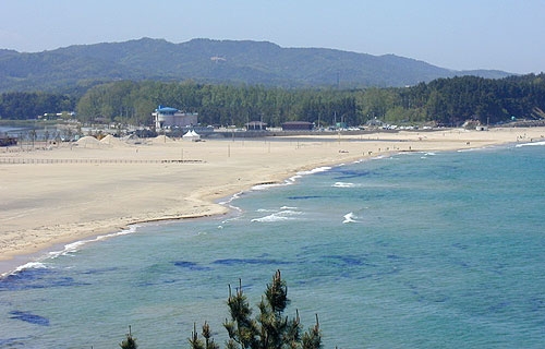 | 동해안 최북단 시범해수욕장으로써 기암괴석이 신비의 극치를 이루고 광활한 호수주변에 울창한 송림이 병풍처 럼 둘러싸인 자연풍광이 수려한 해변이다. 수만년동안 조개껍질과 바위가 부서져 만들어진 모나즈 성분의 모래는 밟으면 소리가 나고 개미가 살지 않는 것이 특징이며, 바닷물이 깨끗하고 수심이 얕아 해수욕장으로 최적이다. |