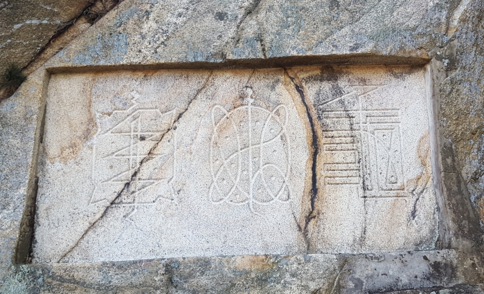 삼귀자(三龜字) 조선 말기 종두법을 실시한 지석영의 형 지운영(1852-1935)이 여기 백련암지에서 은거할 당시에 쓴 글로 바위면을 다듬어 음각으로 거북 귀자를 새겨 놓았다. |
