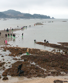 바다가 갈라지면 미역이며 바지락, 낙지 등 풍부한 해산물이 들어나 관광객들도 조금만 품을 팔면 비닐봉지 한가득 주워나올 수 있다. 아이도 시간가는 줄 모르고 조개잡는 재미에 빠져있다.