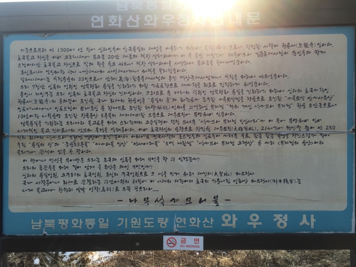 이 시대의 자랑이자 호국의 기운서린 연화산 와우정사는 세계불교사에 찬란히 빛날 명찰로 우뚝 솟으리니 · · ·