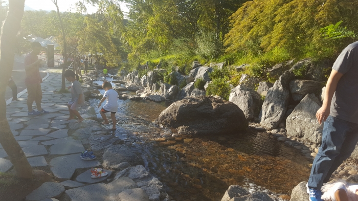 동굴입구 바로앞에 졸졸졸 흐르는 물에 아이들은 즐거워하며 발을 담근다.