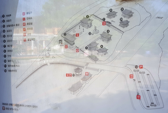 일주문 대신 기둥 18개가 받치고 있는 누각이 있고 앞에 붙어있는 현판에는 지리산겁외사(智異山劫外寺)라고 써 있다. 누각 뒤에는 벽해루(碧海樓)라는 현판이 걸려 있는데, 이는 홍하천벽해(紅霞穿碧海; 아침의 붉은 해가 푸른 바다를 뚫고 솟아오른다)에서 나온 것이다.