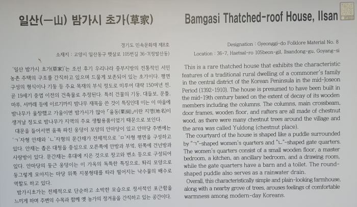 정발산의 북동쪽에 위치한 이 초가는 현재 일산 신시가지 개발로 인하여 주변이 새롭게 정비되면서 남게 되었는데, 독특한 지역적 특성을 살린 조선 후기의 전통적인 경기 지방 농가의 모습을 가지고 있는 귀중한 유구(遺構)이다. (자료출처 : 『경기문화재총람-도지정편2』)