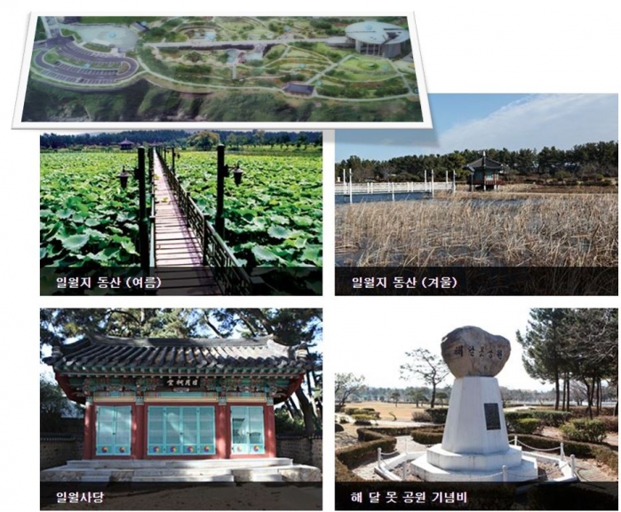 인공암벽, 연오랑세오녀 이야기벽, 한국뜰과 방지연못, 정자 일월대, 연오랑세오녀의 거북바위, 신라마을 초가집, 철예술뜰 작품 등