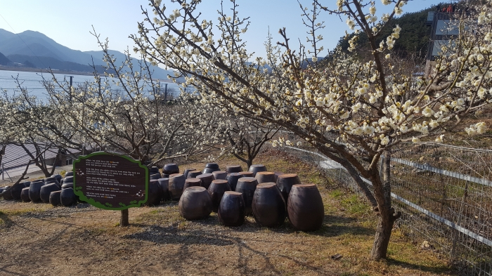 광양 매화마을처럼, 해남 보해매실농원을 처럼 걸으며 담소하며 풍경을 즐기며 매실특산물을 사고 음식도 사 먹는 곳이다. 매화나무 아래 항아리 때가 종종종 줄맞춰 있다.물레방아가 돌아가며 방문객을 반긴다.