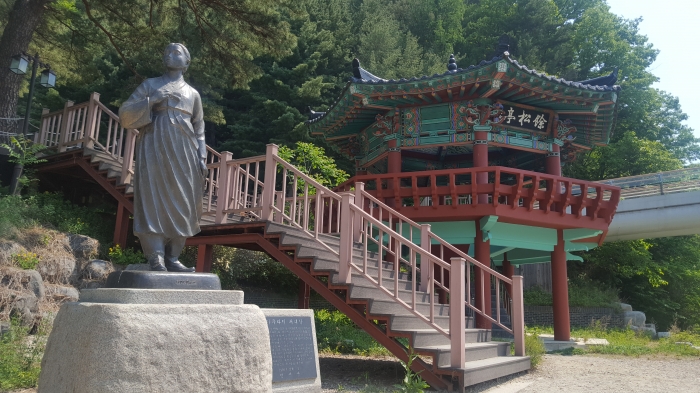 정선읍으로부터 승용차로 약 30분 거리에 거리에 아우라지에 정자각인 여송정이 있다. 소나무와 어우러진 정자 여송정에는 아우라지 처녀상이 있다. 정선아리랑 ‘애정편’을 기리고자 정선군에서 처녀상을 세웠다고 한다. 아우라지 처녀와 애절한 사랑을 나눈 총각은 강 건너 정선아리랑전수관 근처에서 여송정을 향해 세워져 있다. 아우라지 강변에 얽힌 송천의 처녀와 여량의 총각의 애절한 사랑 이야기를 전하기 위하여 송천과 여량, 두 마을의 이름을 따 여송정이라 붙였다고 한다. 주민들이 성금을 모아 여송정을 세웠다. 여송정 옆으로 조성된 옛길 산책로를 거닐며 풍경을 즐길 수도 있다. (출처 : 강원도청)