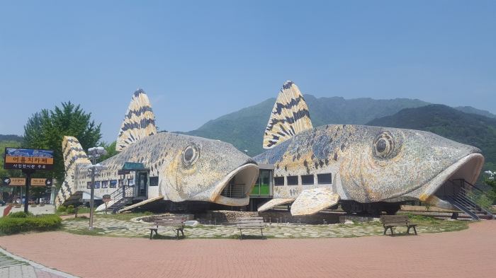 아우라지역 앞의 커다란 어름치 두마리 모양의 전시관 카페도 가 볼만 하다.