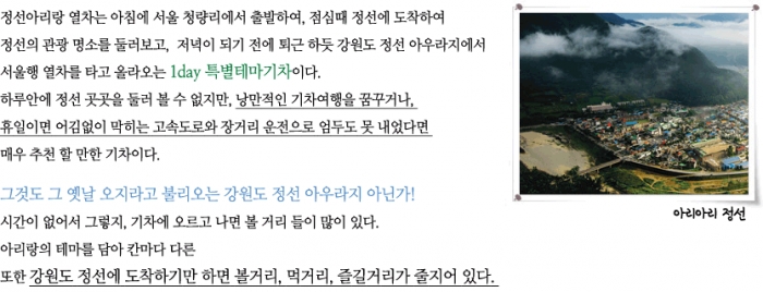 정선아리랑열차(http://a-train.7788.co.kr)를 이용해 가는 방법이 가장 낫다.