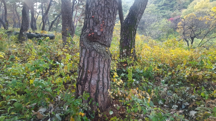 여기에 있는 소나무는 역사의 아픔을 간직하고 있다. 아름드리 소나무밑둥에 한결같이 V字 모양의 흉터가 있는데 이는 제강점기 일제가 패망직전에 연료로 쓰고자 송진을 채취하려고 주민들을 동원해 낸 상처이다. 언뜻보면 소나무가 웃는 것처럼 보이는데 이제는 하트모양♡이 되었다. 그래서 보는 한국사람들의 마음은 더욱 저린다. 인간은 나무를 해치는데 나무는 인간을 돕기만 하는 것을 깨달으며 배움이 있기도 하다.