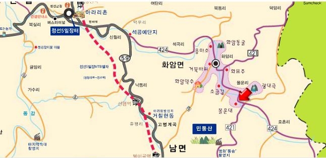 [가는 길] 정선읍 - 남면방향 59번국도 - 덕우삼거리 앞424번 지방도로 - 화암면 - 소금강 5km