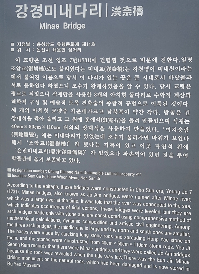 충청남도 유형문화재 제11호 미내다리는 길이 30m, 너비 2.8m, 높이 4.5m로 크지도 넓지도 않지만 300년전만 해도 조선시대 충청도와 전라도를 잇는 삼남에서 가장 큰 다리로, 3개의 아치가 있는 무지개다리(홍예)는 빼어난 건축미를 자랑한다. (금강 하구의 미내다리는 경상·전라·충청도를 통틀어 삼남 최고의 석교였으며, 전라도와 충청도를 잇는 역할을 했다)