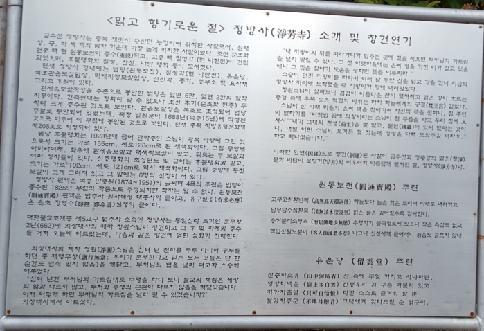 금수산 정방사는 충북 제천시 수산면 능강리에 있는 사찰로, 법당(원통보전), 칠성각(현 나한전), 유운당, 석조관음보살입상, 마애지장보살입상, 산신각, 종각, 종무소 및 요사채 그리고 후원이 있다.