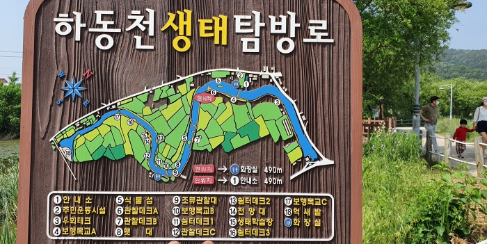 한강수계 소하천인 하동천은 자연경관이 좋고 기러기와 청둥오리 등 조류와 두더지, 너구리, 족제비 같은 포유류, 135종에 달하는 관속식물을 만날 수 있는 생태계의 보물창고이다. 하동천을 따라 황토길, 관찰 데크, 쉼터데크 등 탐방시설과 특화조형물, 생태학습장 등 체험시설이 조성되어 있다.