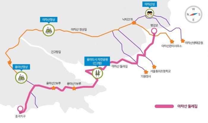 걷기의 명소로 자리잡은 아차산 둘레길은 구민이 이용시 불안감을 해소하고 안전하게 이용할 수 있도록 조성된 길이다. 평강교(시작지점)에서 중곡지구(용마)까지 총 3.8㎞로 구성되어 있으며, 일상의 지친 몸과 마음에 새로운 활력을 불어넣고 맑은 공기를 마시며 도심속 힐링을 만끽할 수 있다.(소요시간 : 90분)