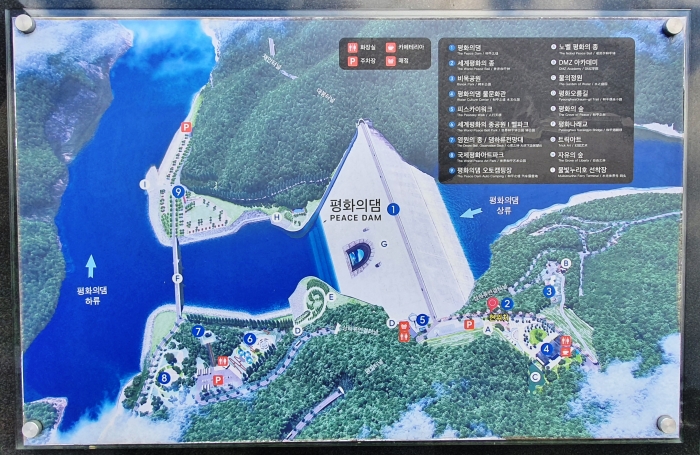 평화 스카이워크라서 이름 붙여진 <피스카이워크>는 투명한 유리판 위를 걸으며 아래 물을 보는 다리떨림을 즐길 수 있다. 평화의댐 하류쪽이다. 볼 것도 많고 들려 사진 찍을 곳도 많아 한 두시간 걸린다.