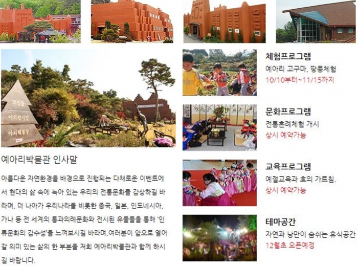 예아리박물관은 오랜 시간을 거쳐 전승된 우리 문화인 ‘관.혼.상.제’를 한데 모아 소개하고 다양한 체험, 교육을 제공하는 최고의 전통문화 테마 관광지를 목적으로 설립됐다. 아름다운 자연환경을 배경으로 진행되는 다채로운 이벤트를 통해 현대의 삶 속에 녹아 있는 우리의 전통문화를 소개하는 활동을 한다.
