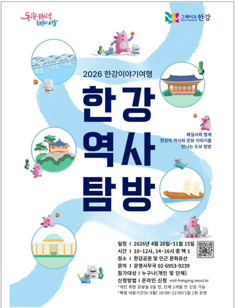 참여 접수는 4월 10일(금) 9시부터 한강이야기여행 누리집 https://visit-hangang.seoul.kr/ 을 통해 선착순으로 진행되며, 참여 희망일 5일 전까지 신청하면 된다. 외국인, 장애인 및 단체 참여자 또한 누리집을 통해 신청할 수 있다. 폭염대응기간(6~9월)은 1일 1회 오전(10~12시)에만 운영되며, 프로그램 일정은 기상·현장 조건에 따라 일부 변동될 수 있다. 자세한 내용은 <한강역사탐방> 운영사무국(☏02-6953-9239)으로 문의하면 된다.
