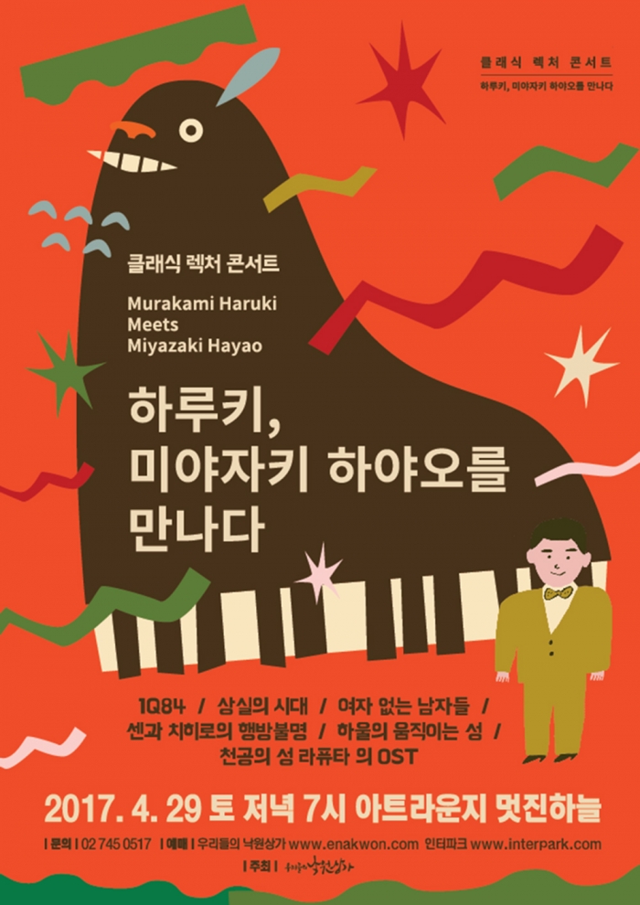 먼저 429일 저녁 7시에는 클래식 렉처 콘서트 "하루키, 미야자키 하야오를 만나다"가 예정되어 있다. 무라카미 하루키의 작품과 미야자키 하야오의 영화에 등장하는 음악들을 피아노 5중주로 들을 수 있는 특별한 기회다. 소설과 애니메이션 속에서 살아 움직이며 분위기를 주도하는 주옥 같은 선율들을 신예 지휘자 안두현이 친절하게 설명할 예정이다. 입장권은 10일까지 낙원악기상가 홈페이지 또는 인터파크에서 예매할 수 있으며, 가격은 3만 원이다.