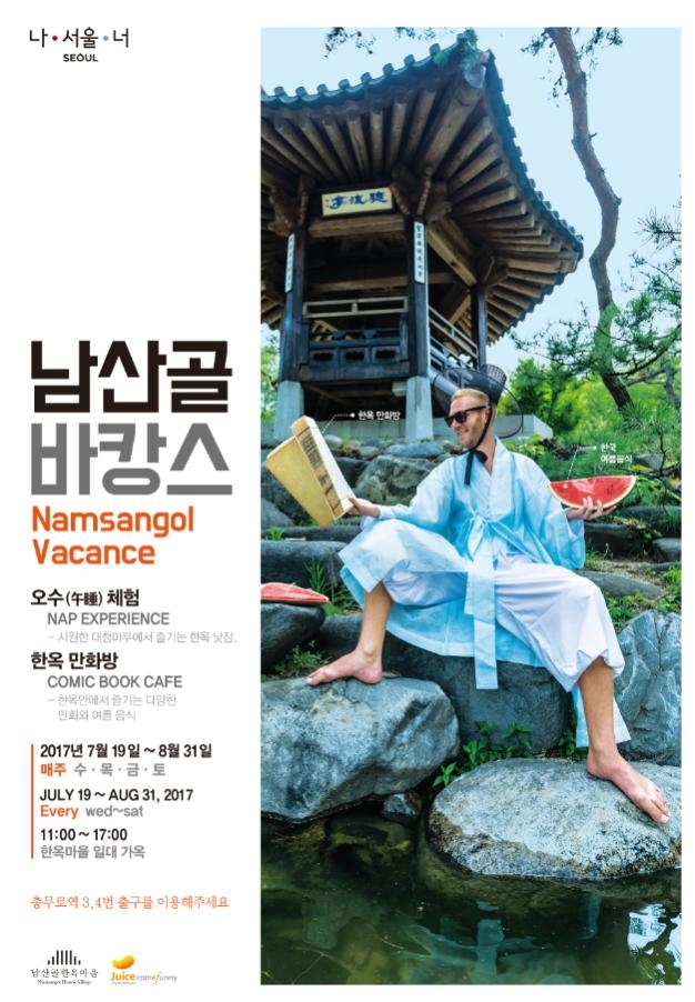 8월 31일(목)까지 매주 수요일부터 토요일 오전 11시에서 오후 5시, <남산골바캉스>에서 옛 선조들의 피서법을 재현해 시원한 한옥 대청마루에서 낮잠을 자는 ‘오수(午睡) 체험’, 다양한 종류의 책을 여유롭게 즐기는 ‘한옥만화방’과 함께 재미있는 추억을 만들어 보는 것은 어떨까.