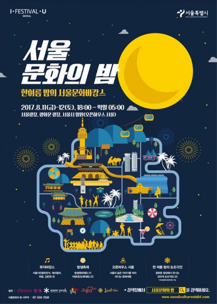 8월 11일(금)~12일(토) 양일간, 오후 6시부터 익일 5시까지 서울광장, 광화문광장을 중심으로 「서울문화의 밤」이 펼쳐진다. 뮤직바캉스, 밤샘프로그램(영화제, 야광축제), 한여름 밤의 눈조각전, 오픈하우스 서울 등 밤새도록 즐기는 서울문화바캉스와 함께 열대야를 이겨보자.