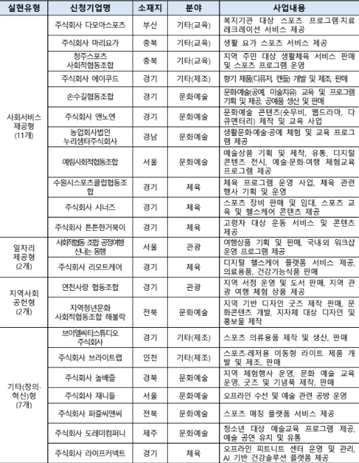 지정된 기업들은 ▴유·청소년, 고령자, 장애인 등 취약계층을 대상으로 문화예술·스포츠 교육과 체험프로그램을 운영해 지역민의 문화 향유 기회 확대, ▴물리치료사 등과 운동선수를 연계하는 플랫폼 운영 등으로 일자리 창출, ▴친환경소재, 의류 재활용 등으로 환경문제 해결 등, 다양한 분야에서사회적 목적을 실현하기 위해 활동할 예정이다.