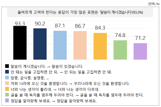 개선해야 한다는 응답이 가장 높게 나타난 항목은 ‘그 제품은 품절이십니다’, ‘커피 나오셨습니다’ 등 ‘과도한 높임 표현’으로, 응답자의 93.3%가 바꾸어 써야 한다고 응답했다. 개선이 필요하다고 응답한 비율이 70% 이상으로 높게 나타난 항목은 어법 오류, 부적절한 어휘 사용, 차별∙혐오 표현 등 영역별로 다양했다. 과도한 높임 표현 다음으로는 어법 오류 중 하나인 ‘되-돼’ 혼동(90.2%)을 개선해야 한다는 응답이 많았다. 이외에 국민은 ‘염두에 두다’ 사용 오류(74.8%)와 ‘(알아)맞추다-(알아)맞히다’ 혼동(71.2%)과 같은 어법 오류를 개선이 필요한 항목으로 꼽았다. 이어서 ‘-충(87.1%)’과 ‘장애를 앓다(78.7%)’와 같은 혐오∙차별 표현을 개선해야 한다는 응답이 70%를 훨씬 넘는 비율로 나타났다.